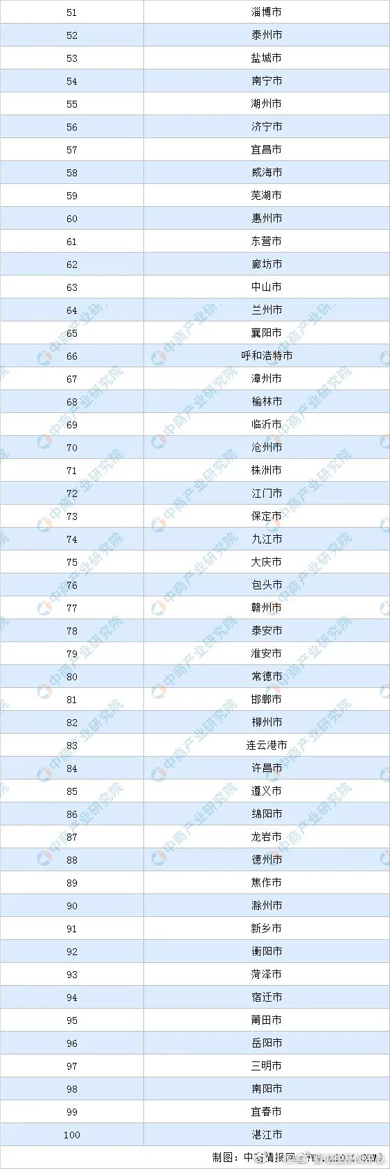 中部地區(qū)河南上榜城市最多,有6座百強城市;其次是湖南,有5座城市上榜,江西和安徽各有4座和3座城市上榜。