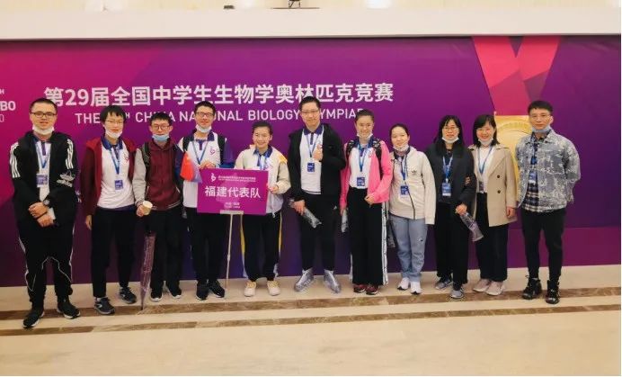 福建代表團(tuán)師生合影,右一為福建隊(duì)總教練、福建師大附中生物競(jìng)賽總教練張碩老師,右三福建省領(lǐng)隊(duì)師大生物系高媛媛老師,右二福建省教練師大生物系陳麗妃老師。