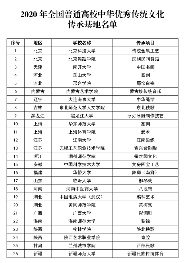 教育部辦公廳關(guān)于公布2020年全國普通高校中華優(yōu)秀傳統(tǒng)文化傳承基地名單的通知