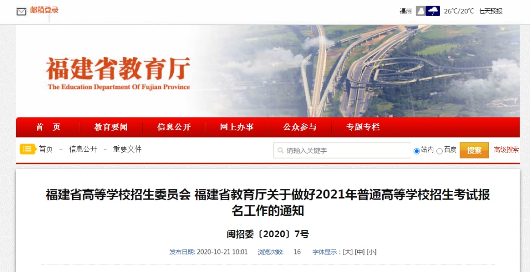 臺(tái)海網(wǎng)10月21日訊 剛剛,福建省教育廳官網(wǎng)發(fā)布2021年高考報(bào)名通知:2020年11月1日至6日,符合報(bào)名條件的考生開(kāi)始網(wǎng)上報(bào)名并繳費(fèi)。