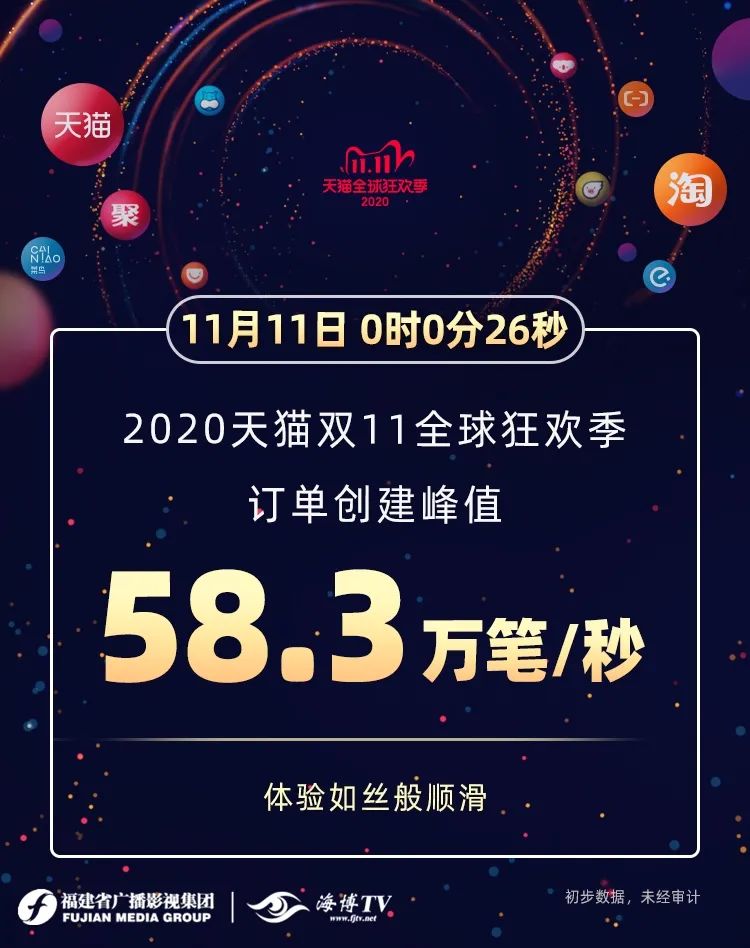今天零點剛過,在2020天貓雙11全球狂歡季紀錄之夜,據(jù)雙11實時交易數(shù)據(jù)顯示,11月1日至11日,2020天貓雙11訂單創(chuàng)建峰值達58.3萬筆/秒,再創(chuàng)新紀錄。