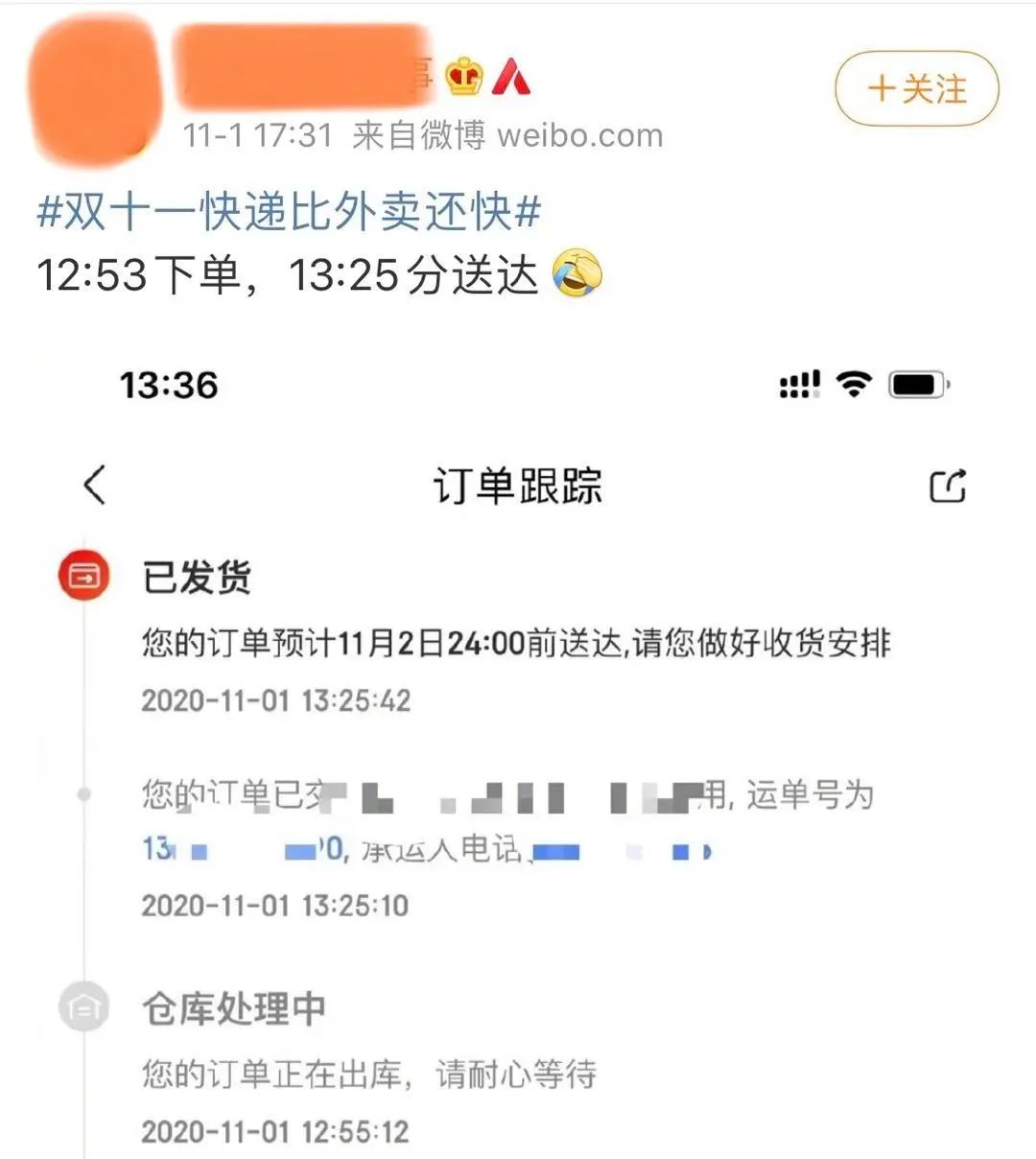 今年天貓雙11,不少人發(fā)現(xiàn)快遞悄悄提速了,在微博話題榜上#今年雙十一快遞有多快#登上熱搜!