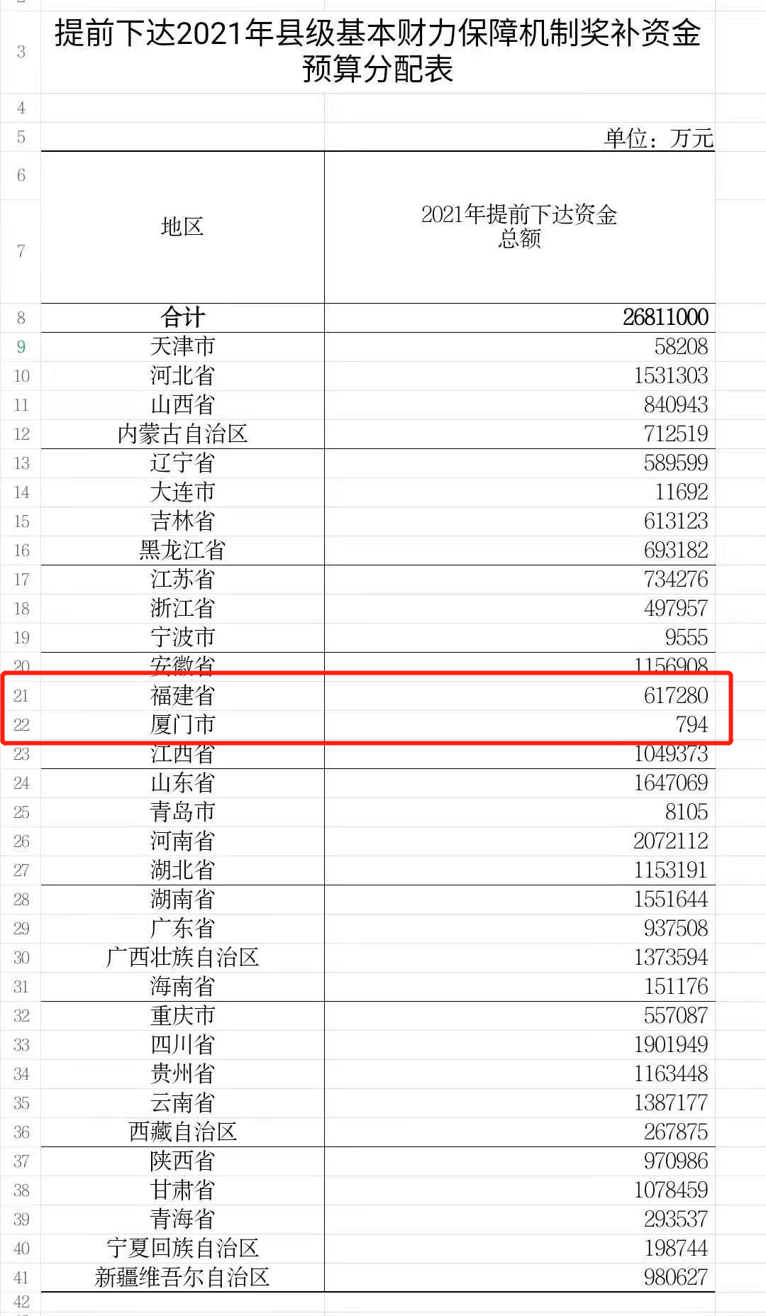 臺(tái)海網(wǎng)11月14日訊 據(jù)福建日?qǐng)?bào)微信報(bào)道 11月13日,財(cái)政部官網(wǎng)發(fā)布通知表示,提前下達(dá)2021年縣級(jí)基本財(cái)力保障機(jī)制獎(jiǎng)補(bǔ)資金預(yù)算,獎(jiǎng)補(bǔ)資金涉及33個(gè)省(區(qū)、市),總額為2681.1億元。其中,福建省61.728億元,廈門市794萬(wàn)元。
