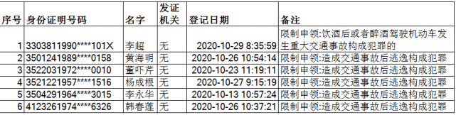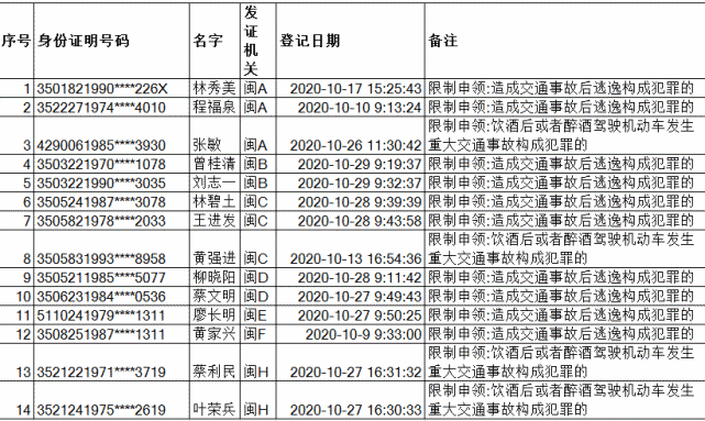臺(tái)海網(wǎng)11月14日訊 據(jù)“福建交警微發(fā)布”微信發(fā)布 為推進(jìn)全省秋冬季交通安全整治百日會(huì)戰(zhàn)工作,福建省公安廳交警總隊(duì)曝光10月份全省終生禁駕人員名單。