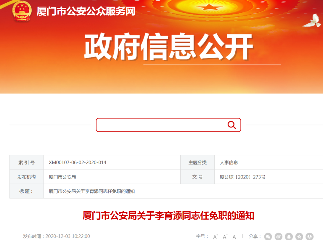 李育添同志任廈門市公安局禁毒支隊(duì)支隊(duì)長,免去其廈門市公安局技術(shù)偵察支隊(duì)政治委員職務(wù)。