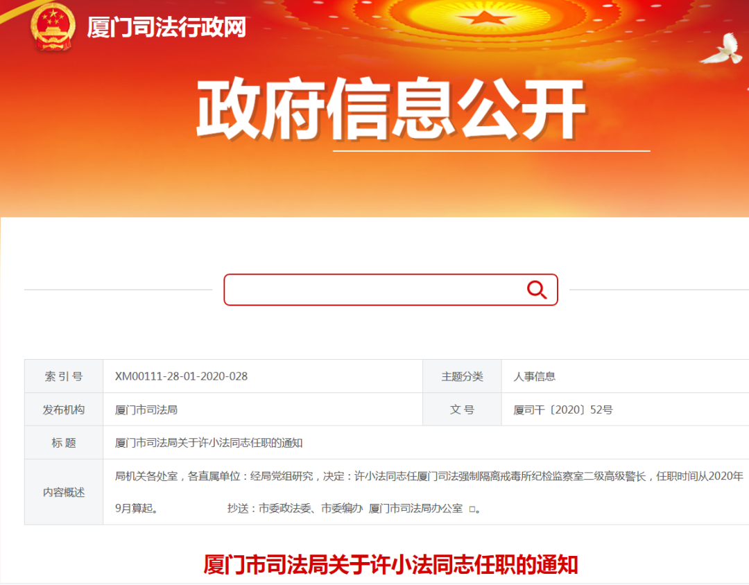 許小法同志任廈門司法強(qiáng)制隔離戒毒所紀(jì)檢監(jiān)察室二級(jí)高級(jí)警長,任職時(shí)間從2020年9月算起。