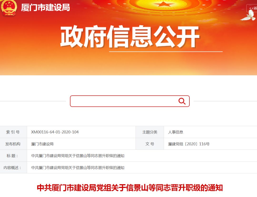 信景山、夏世林同志晉升為廈門市建設(shè)工程質(zhì)量安全站一級(jí)調(diào)研員,晉升時(shí)間從2020年11月9日算起。