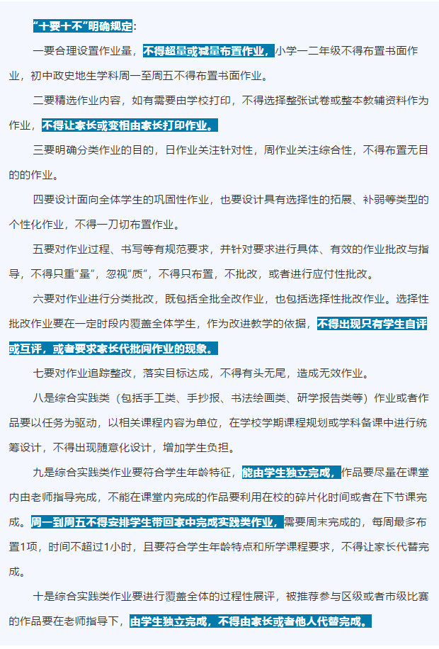 為減輕中小學(xué)生作業(yè)負(fù)擔(dān)、減輕家長(zhǎng)負(fù)擔(dān),山東省濰坊市高新區(qū)教育局出臺(tái)《濰坊高新區(qū)學(xué)生作業(yè)規(guī)范“十要十不”》,其中明確