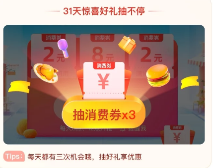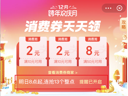 有些小伙伴一定發(fā)現(xiàn)了,這個活動從12月就開始了。12月跨年歡慶月從12月1日到12月31日每天8:00和12:00,都有消費券可以搶,大點小店都能用。