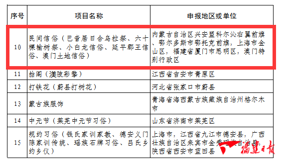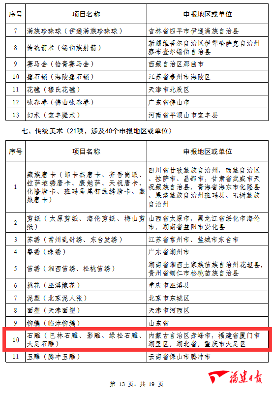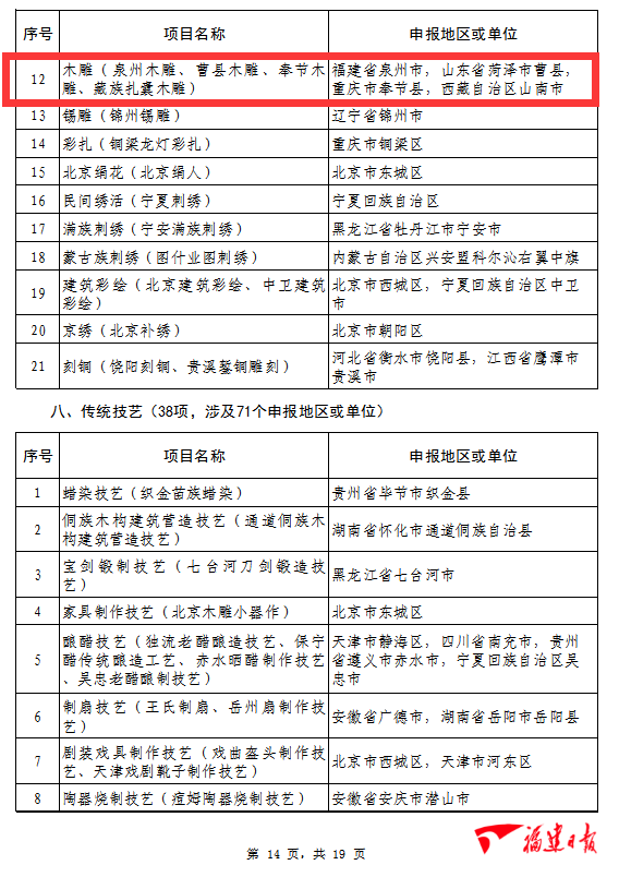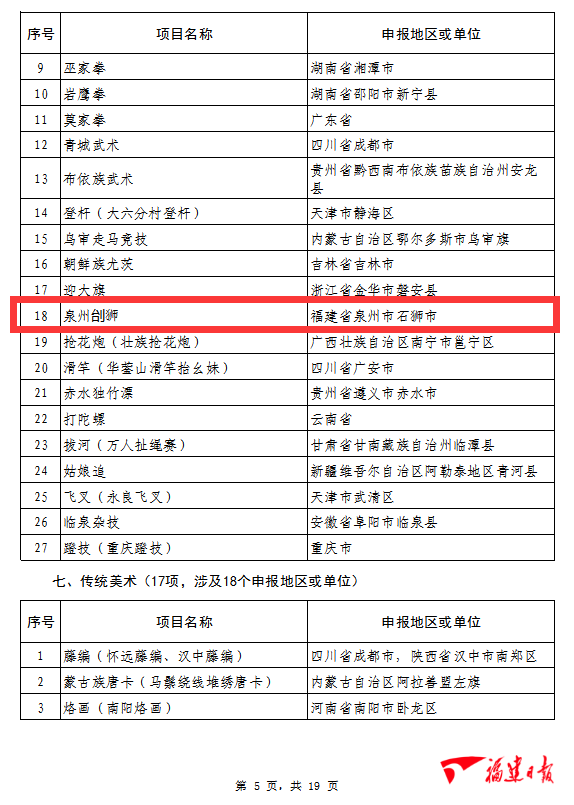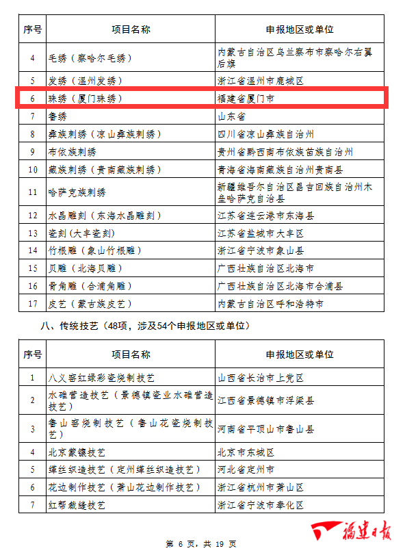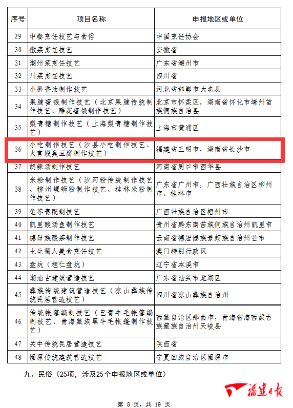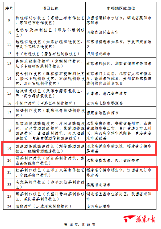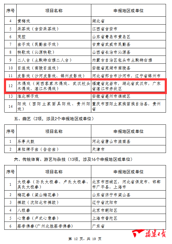 臺海網(wǎng)12月22日訊 據(jù)福建日報·新福建APP綜合報道 文旅部發(fā)布關(guān)于第五批國家級非物質(zhì)文化遺產(chǎn)代表性項目名錄推薦項目名單的公示,推薦項目337項,其中,新列入198項,擴展139項。福建的福清佾舞、三明雜劇作場戲、六合拳、泉州刣獅、廈門珠繡、沙縣小吃制作技藝、閩西客家木偶戲、廈門石雕、泉州木雕、寧德紅粬黃酒釀造技藝、寧德福安坦洋工夫茶制作技藝、龍巖漳平水仙茶制作技藝、福建香制作技藝、福建中醫(yī)診療法、廈門延平郡王信俗等15項上榜!詳見↓