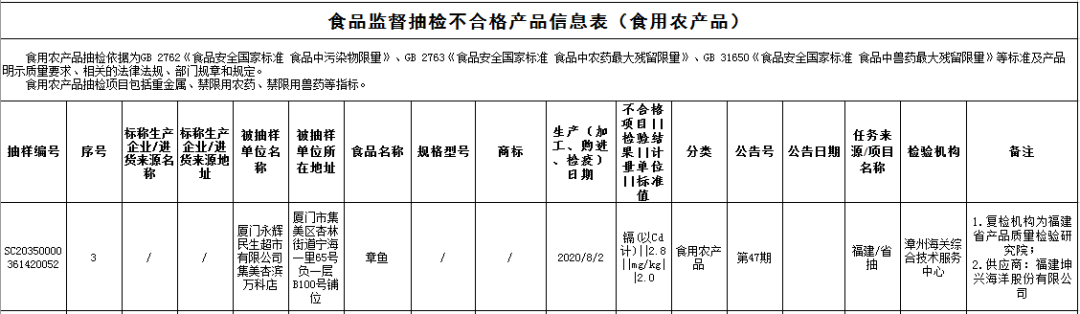 ?廈門永輝民生超市有限公司集美杏濱萬科店銷售的章魚(購進日期為2020年8月2日),鎘(以Cd計)不合格,初檢機構(gòu)為漳州海關(guān)綜合技術(shù)服務(wù)中心,復檢機構(gòu)為福建省產(chǎn)品質(zhì)量檢驗研究院。