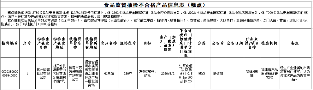 ?標稱杭州駿喜食品有限公司2020年5月2日生產(chǎn)的板栗餅,過氧化值(以脂肪計)不合格,銷售單位為福清市萬萬佳購物廣場有限公司,檢驗機構(gòu)為福建省產(chǎn)品質(zhì)量檢驗研究院。經(jīng)生產(chǎn)企業(yè)屬地市場監(jiān)管部門核實,認為該批次產(chǎn)品為假冒產(chǎn)品。