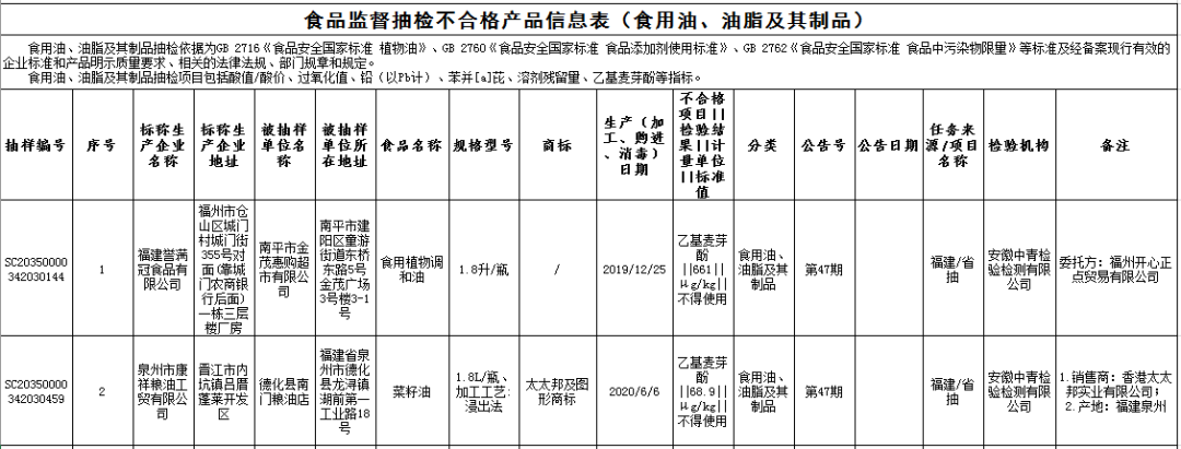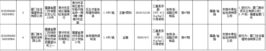 ?標稱廈門原光植物油有限公司2020年4月3日生產(chǎn)的食用植物調(diào)和油,乙基麥芽酚不合格,銷售單位為漳州市悅品生鮮超市有限公司,檢驗機構(gòu)為安徽中青檢驗檢測有限公司。