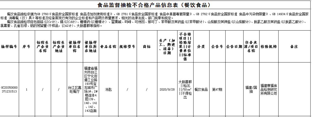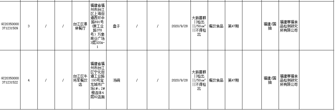 ?臺江區(qū)牛將軍餐飲店的湯碗(消毒日期為2020年9月28日),大腸菌群不合格,檢驗機構(gòu)為福建賽福食品檢測研究所有限公司。