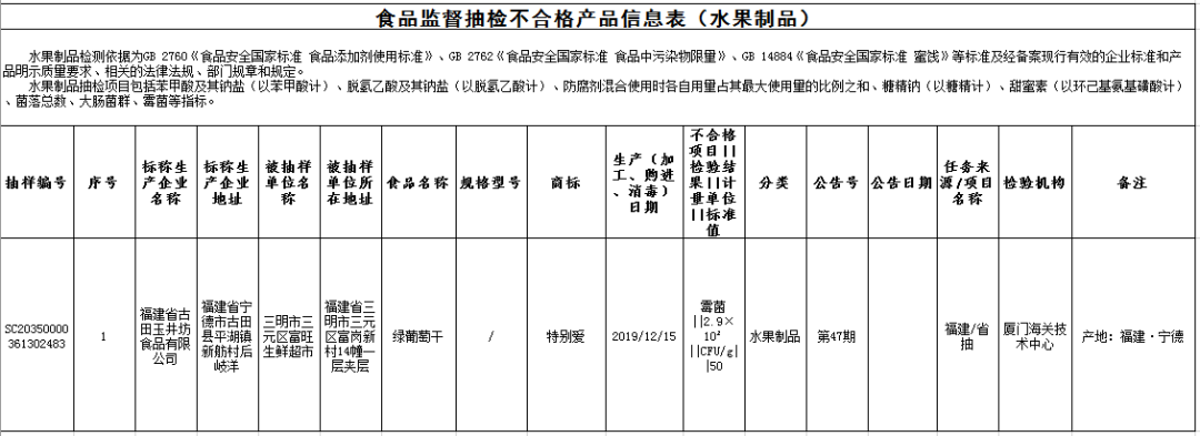 ?標稱福建省古田玉井坊食品有限公司2019年12月15日生產(chǎn)的綠葡萄干,霉菌不合格,銷售單位為三明市三元區(qū)富旺生鮮超市,檢驗機構(gòu)為廈門海關(guān)技術(shù)中心。