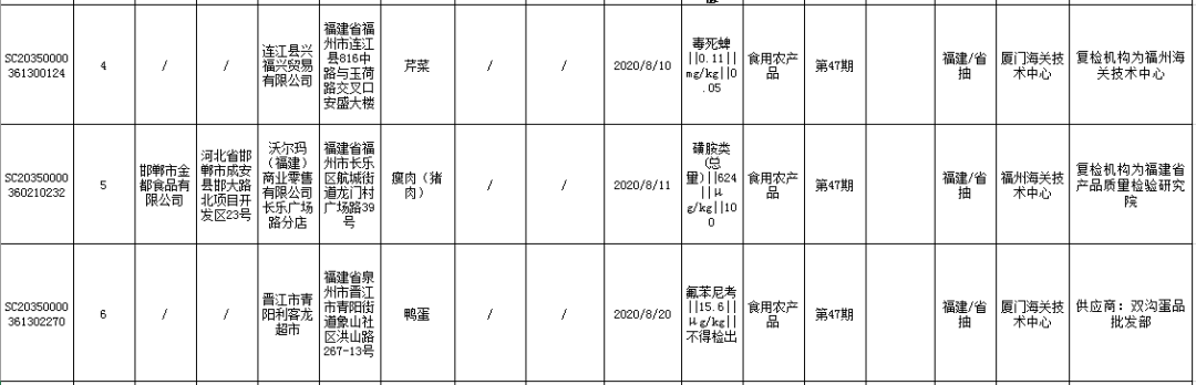 ?晉江市青陽利客龍超市銷售的鴨蛋(購進日期為2020年8月20日),氟苯尼考不合格,檢驗機構(gòu)為廈門海關(guān)技術(shù)中心。