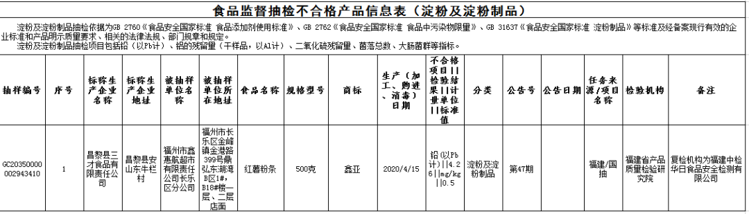 ?標稱昌黎縣三才食品有限責任公司2020年4月15日生產(chǎn)的紅薯粉條,鉛(以Pb計)不合格,銷售單位為福州市鑫惠航超市有限責任公司長樂區(qū)分公司,初檢機構(gòu)為福建省產(chǎn)品質(zhì)量檢驗研究院,復檢機構(gòu)為福建中檢華日食品安全檢測有限公司。