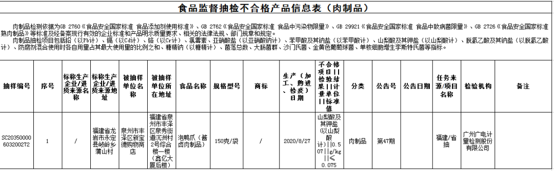 ?泉州市豐澤區(qū)新寶德購物商店銷售的泡鴨爪(醬鹵肉制品)(生產(chǎn)日期為2020年8月27日),山梨酸及其鉀鹽(以山梨酸計)不合格,檢驗機構(gòu)為廣州廣電計量檢測股份有限公司。