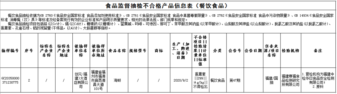 ?創(chuàng)元(福建)大酒店有限公司銷售的海蚌(購進日期為2020年9月2日),氯霉素不合格,初檢機構(gòu)為福建賽福食品檢測研究所有限公司,復檢機構(gòu)為福建中檢華日食品安全檢測有限公司。