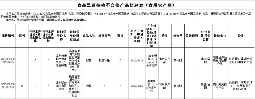 ?漳州新華都百貨有限責任公司金峰店銷售的鱸魚(購進日期為2020年9月16日),孔雀石綠不合格,檢驗機構(gòu)為福建省產(chǎn)品質(zhì)量檢驗研究院。