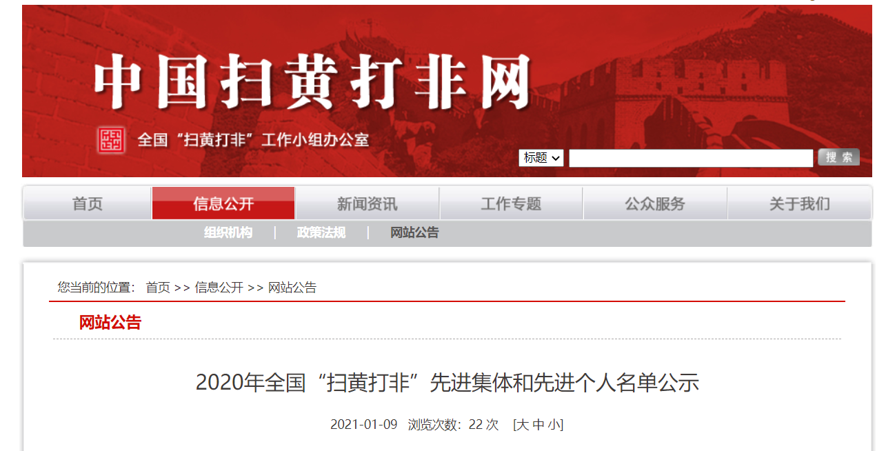 2020年全國“掃黃打非”先進集體和先進個人評審結果于2021年1月9日至1月15日向社會公示。