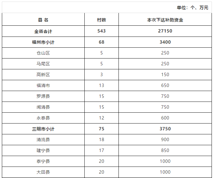 中央、省級財政對每個被扶持的行政村一次性補助50萬元,市縣財政安排不少于10萬元補助資金。(來源:閩北日報)