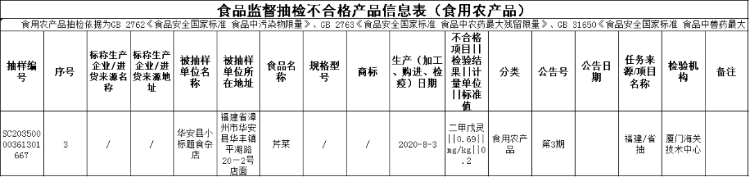 華安縣小標(biāo)題食雜店銷售的芹菜(購進(jìn)日期為2020年8月3日),二甲戊靈不合格,檢驗(yàn)機(jī)構(gòu)為廈門海關(guān)技術(shù)中心;