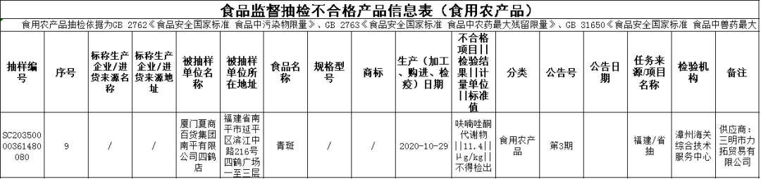 廈門夏商百貨集團(tuán)南平有限公司四鶴店銷售的青斑(購進(jìn)日期為2020年10月29日),呋喃唑酮代謝物不合格,檢驗(yàn)機(jī)構(gòu)為漳州海關(guān)綜合技術(shù)服務(wù)中心;