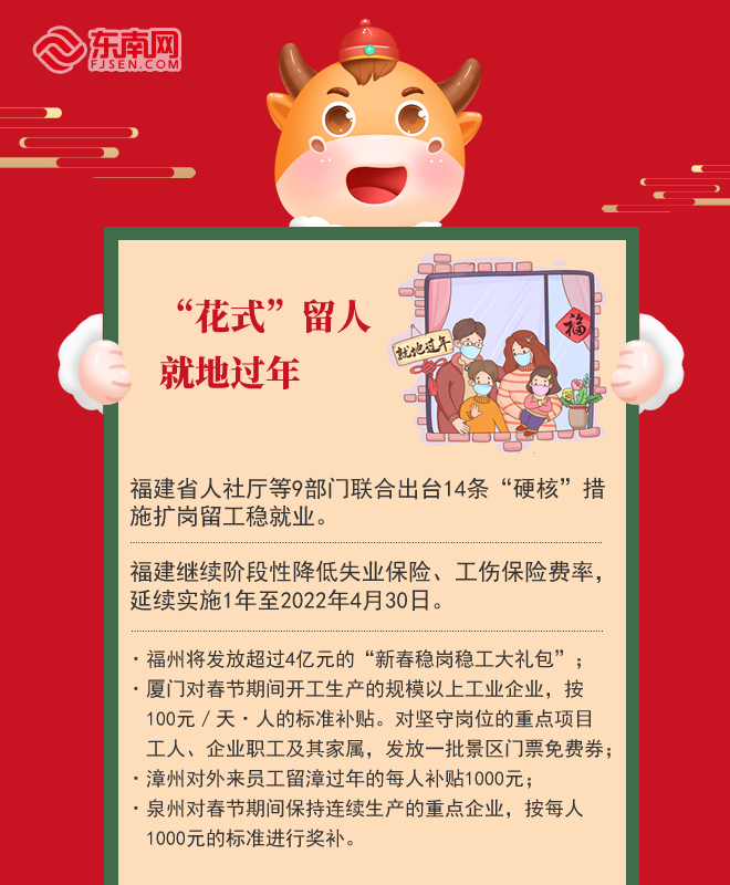 臺海網(wǎng)2月5日訊 據(jù)東南網(wǎng)報(bào)道 牛年春節(jié),在倡導(dǎo)就地過年的背景下,不少人選擇將堅(jiān)守在工作地過年。那么,留在福建的務(wù)工人員就地過年怎么過?有哪些保障?一起來看!