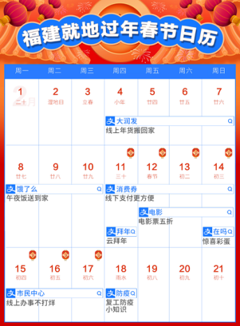 另外,從福建就地過(guò)年春節(jié)日歷可以看出,用戶(hù)只要上支付寶搜,就能獲得相應(yīng)的數(shù)字化服務(wù)。全國(guó)已有包括2200家景區(qū)、400家市民中心、50家出行公司等上萬(wàn)服務(wù)方春節(jié)線(xiàn)上營(yíng)業(yè),聯(lián)合支付寶針對(duì)返鄉(xiāng)、宅家及本地出游三類(lèi)人群推出防疫包、居家樂(lè)、云拜年、云逛街、云理財(cái)、云辦事、優(yōu)惠住、分時(shí)游、免押租等九大類(lèi)“就地過(guò)年”服務(wù)保障。