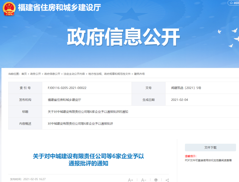 臺海網(wǎng)2月9日訊 據(jù)福建省住房和城鄉(xiāng)建設(shè)廳網(wǎng)站發(fā)布 近日,福建省住房和城鄉(xiāng)建設(shè)廳網(wǎng)站發(fā)布“關(guān)于對中城建設(shè)有限責(zé)任公司等6家企業(yè)予以通報(bào)批評的通知”。通知顯示,6家施工單位未嚴(yán)格落實(shí)農(nóng)民工工資支付保障條例,存在勞務(wù)實(shí)名制落實(shí)不到位、拖欠農(nóng)民工工資并造成不良社會影響等違規(guī)行為,遭福建全省通報(bào)批評。通知全文如下: