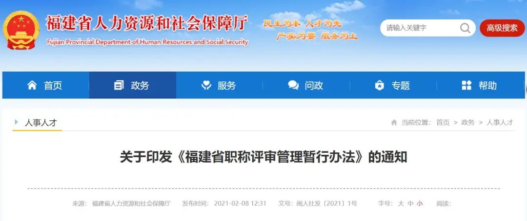 近日,福建省人社廳網(wǎng)站發(fā)布了《關(guān)于印發(fā)<福建省職稱評審管理暫行辦法>的通知》。