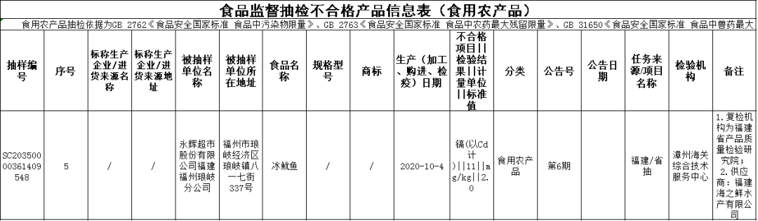?永輝超市股份有限公司福建福州瑯岐分公司銷售的冰魷魚(購(gòu)進(jìn)日期為2020年10月4日),鎘(以Cd計(jì))不合格,初檢機(jī)構(gòu)為漳州海關(guān)綜合技術(shù)服務(wù)中心,復(fù)檢機(jī)構(gòu)為福建省產(chǎn)品質(zhì)量檢驗(yàn)研究院。