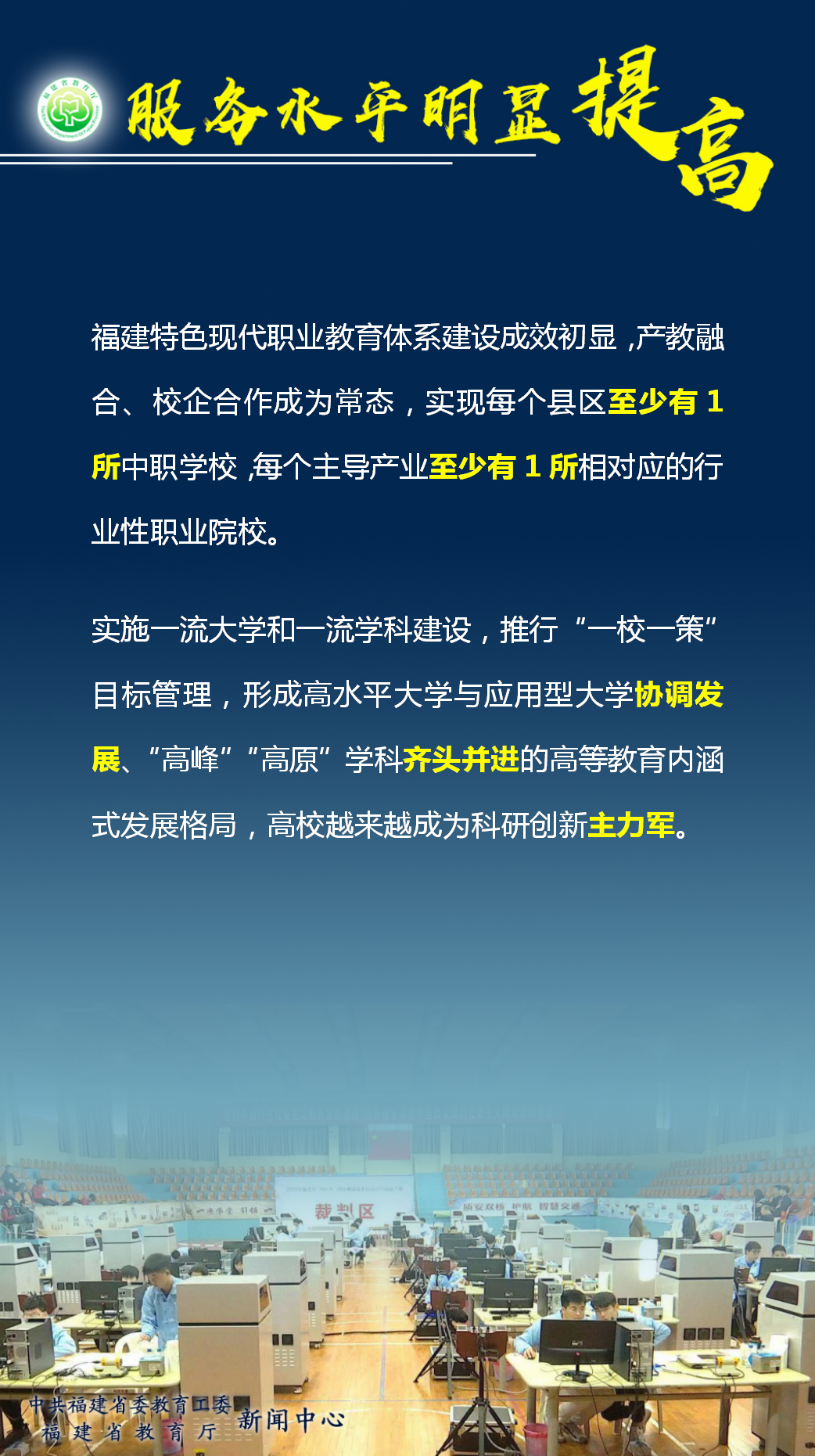 全省教育改革環(huán)境好、措施實(shí),教育發(fā)展速度快、質(zhì)量高,教育為人民服務(wù)、為中國共產(chǎn)黨治國理政服務(wù)、為鞏固和發(fā)展中國特色社會主義制度服務(wù)、為改革開放和社會主義現(xiàn)代化建設(shè)服務(wù)的作用得到了彰顯和發(fā)揮,為全方位推動高質(zhì)量發(fā)展超越和新時代新福建建設(shè)提供了有力的人才支撐和智力支持。
