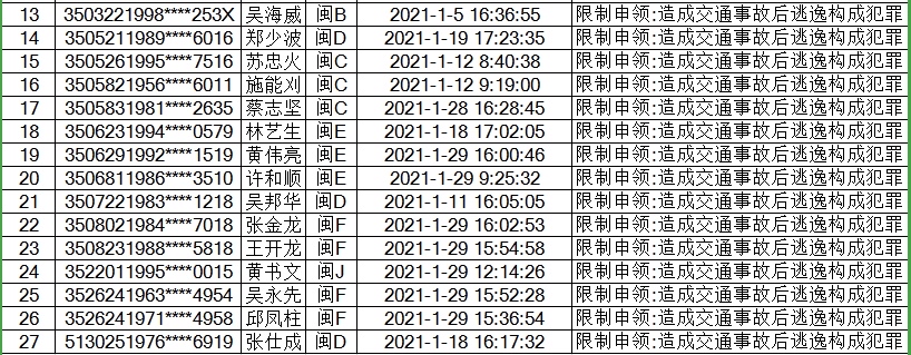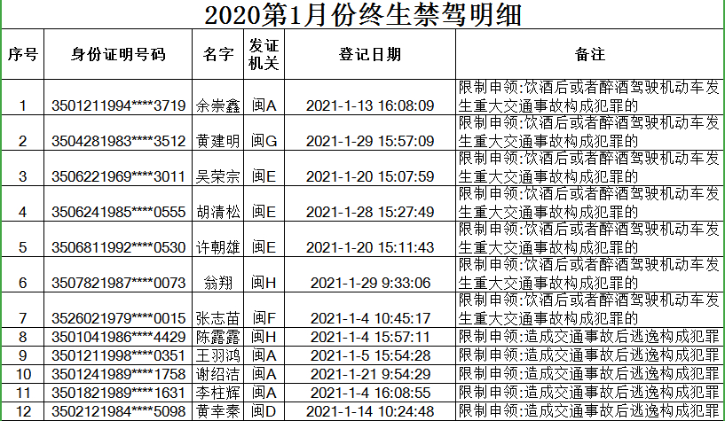 臺海網(wǎng)2月27日訊 據(jù)東南網(wǎng)報道 26日,福建省公安廳交警總隊公布2021年1月份45名被終生禁駕人員名單(見下圖)。