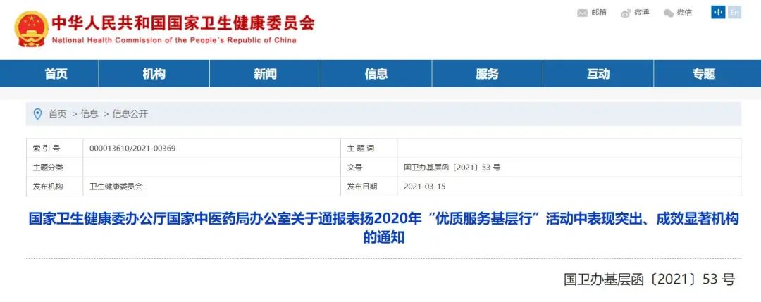 國家衛(wèi)生健康委辦公廳國家中醫(yī)藥局辦公室關(guān)于通報表揚2020年“優(yōu)質(zhì)服務(wù)基層行”活動中表現(xiàn)突出、成效顯著機(jī)構(gòu)的通知
