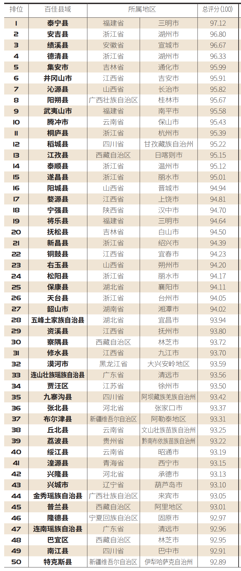 上榜的7地分別為:三明市泰寧縣(排位1)、南平市武夷山市(排位9)、三明市將樂縣(排位19)、南平市邵武縣(排位52)、三明市建寧縣(排位71)、龍巖市長汀縣(排位82)、泉州市永春縣(排位93)。