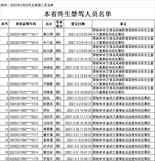 此次公布的2021年3月份31名被終生禁駕人員名單,主要禁駕原因涉及造成交通事故后逃逸構(gòu)成犯罪、因飲酒后或者醉酒駕駛機(jī)動(dòng)車(chē)發(fā)生重大交通事故構(gòu)成犯罪。終生禁駕名單包括福建省駕駛?cè)?9名,福建外省駕駛?cè)?名,無(wú)證駕駛?cè)藛T5人。終生禁駕人數(shù)比2月份減少8人。