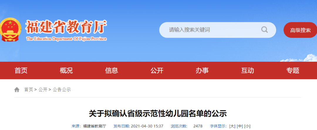 根據(jù)廳里工作安排,我處組織開展了省示范性幼兒園評(píng)估工作。經(jīng)審核,現(xiàn)將擬確認(rèn)為“福建省示范性幼兒園”的幼兒園名單予以公示,公示時(shí)間從2021年4月30日開始,公示期為5個(gè)工作日。如有異議,可于公示期內(nèi)來電來信反映。