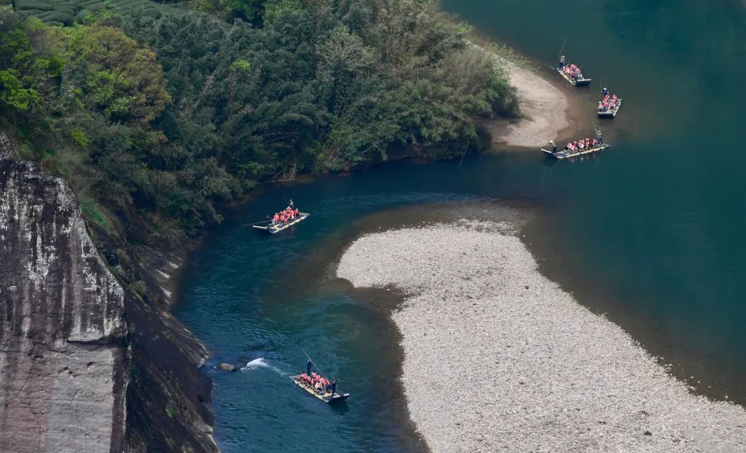 游客在武夷山國(guó)家公園九曲溪乘竹筏游覽。圖片來源:新華社