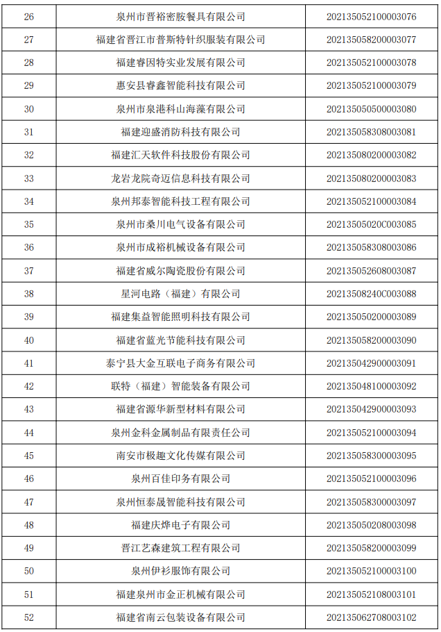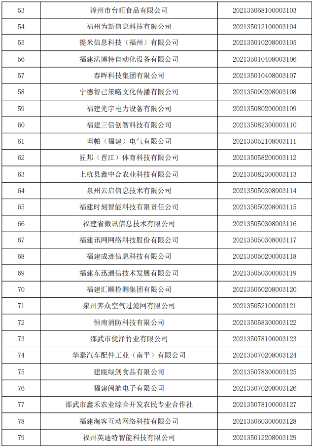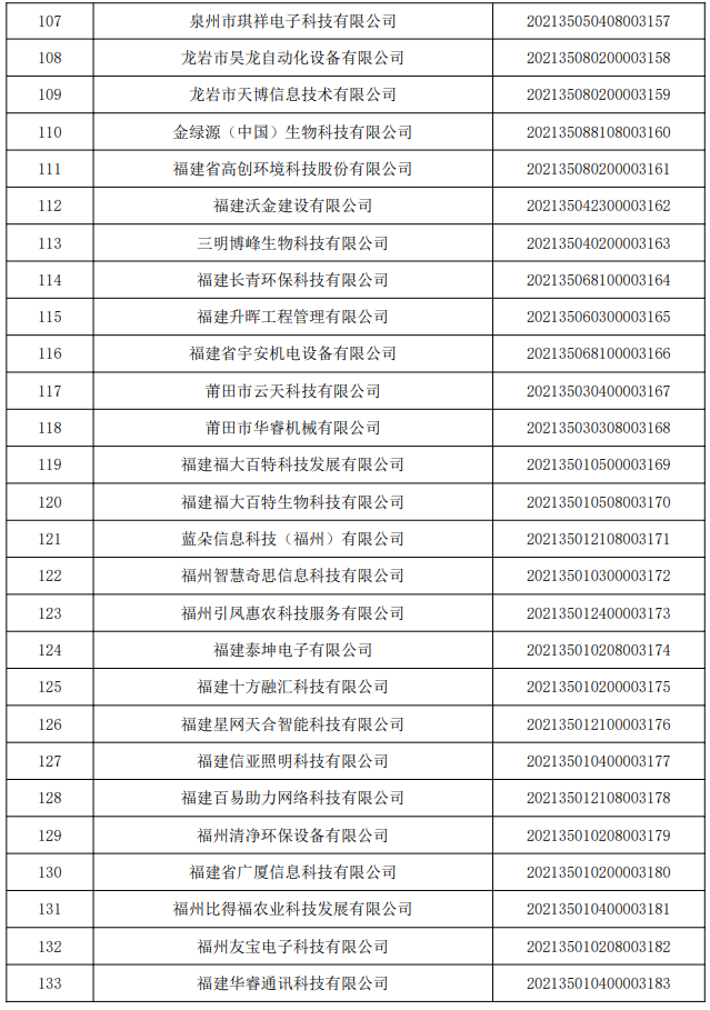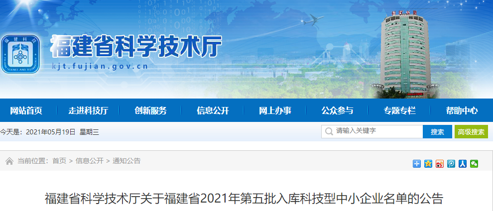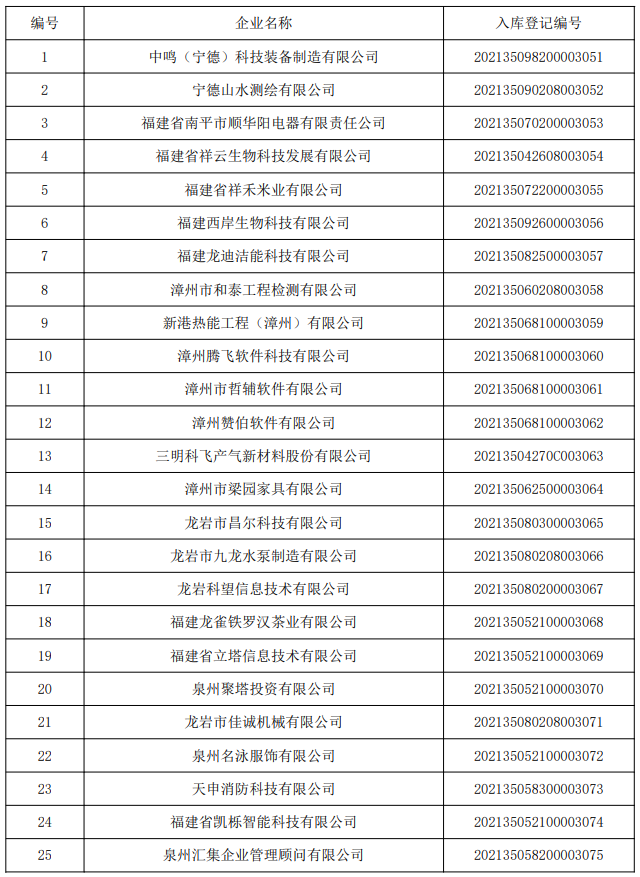 福建省2021年第5批入庫科技型中小企業(yè)名單
