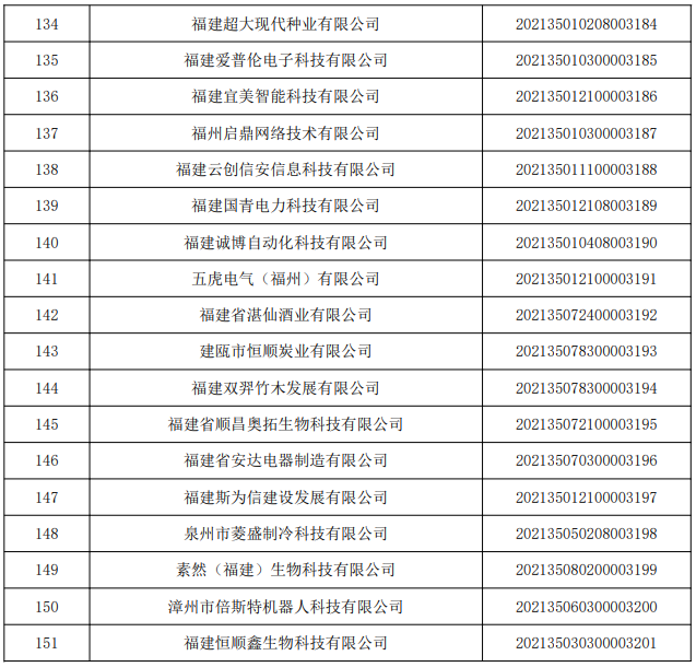 根據(jù)《科技型中小企業(yè)評價辦法》(國科發(fā)〔2017〕115號),經(jīng)公示通過,現(xiàn)將福建省2021年第五批入庫的151家科技型中小企業(yè)名單(詳見附件)予以公告。