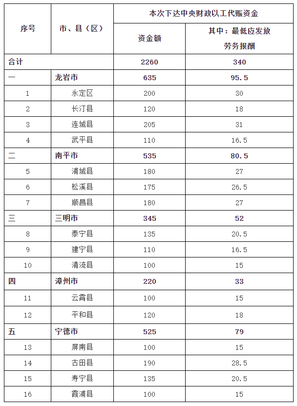 近日,國(guó)家發(fā)展改革委下達(dá)了2021年第二批中央財(cái)政以工代賑任務(wù)計(jì)劃,安排我省中央財(cái)政以工代賑資金2260萬元(其中最低應(yīng)發(fā)放勞務(wù)報(bào)酬340萬元)。根據(jù)有關(guān)要求,現(xiàn)將我省資金下達(dá)方案予以公告。