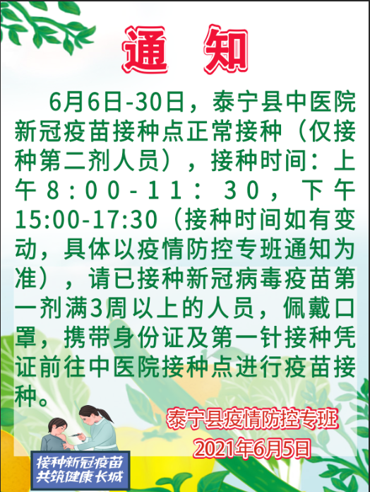 據(jù)泰寧縣應(yīng)對新冠肺炎疫情工作指揮部疫苗接種專班消息,自6月6日起-6月30日,泰寧縣僅接種第二劑人員。