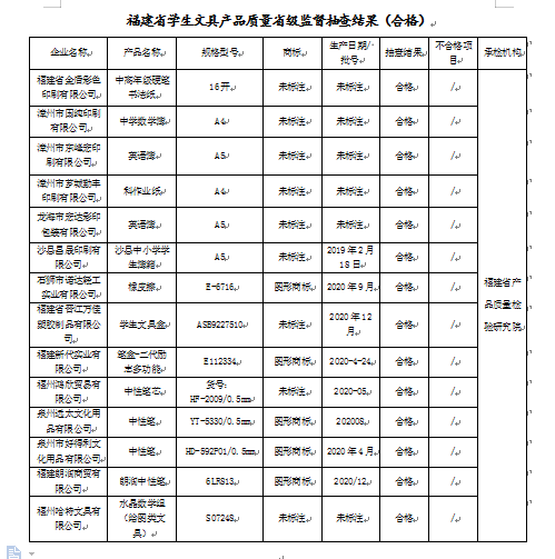 臺海網6月9日訊 據福建市場監(jiān)管部門消息 如果說,學生們是勇敢的戰(zhàn)士,那么學生用品就是最有用的武器。這么重要的物品質量抽檢結果如何?一起來看看吧!