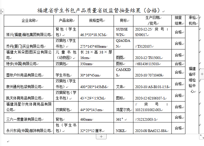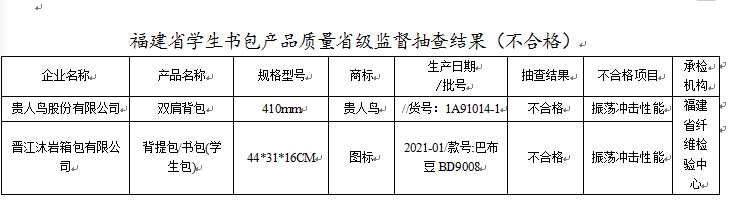 近期,依據《中華人民共和國產品質量法》,福建省市場監(jiān)督管理局組織對學生書包、學生文具開展產品質量省級監(jiān)督抽查,共抽查學生書包12家生產企業(yè)12批次產品,不合格2批次,不合格發(fā)現率為16.67%;抽查學生文具15家企業(yè)15批次產品,不合格1批次,不合格發(fā)現率為6.67%。