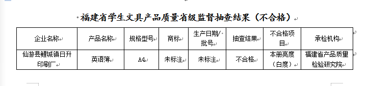 本次學生文具抽查依據GB 21027-2007 《學生用品的安全通用要求》標準要求,對學生文具的可遷移元素的最大限量、筆的上帽安全、本冊亮度(白度)、邊緣尖端等項目進行檢驗。抽查發(fā)現有1批次產品不符合標準規(guī)定,不符合項目為本冊亮度(白度)。