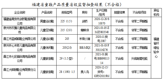 本次抽查童鞋依據(jù)GB 30585-2014 《兒童鞋安全技術(shù)規(guī)范》、QB/T 2880-2016《兒童皮鞋》、QB/T 4331-2012 《兒童旅游鞋》,兒童旅游鞋對幫底剝離強度或底墻與幫面剝離強度、外底耐磨性能、外底硬度、物理機械安全性能、皮革和毛皮中的六價鉻等11個項目進行了檢驗;兒童皮鞋對耐磨性能、剝離強度、外底硬度等16個項目進行了檢驗。抽查發(fā)現(xiàn)有6批次兒童鞋產(chǎn)品不符合標準的規(guī)定,不符合項目為鄰苯二甲酸酯、外底耐磨性能。