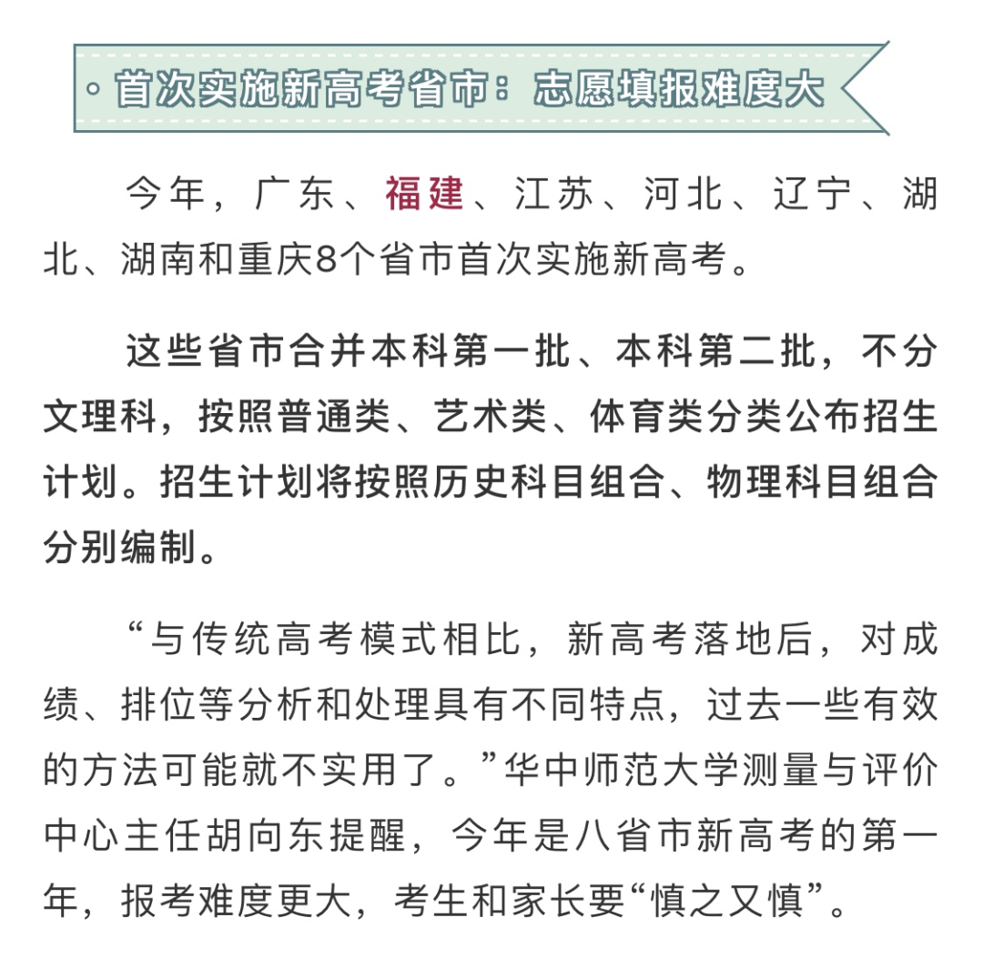 屆時,1078萬考生及其家長,又將面臨另一個考驗——志愿填報。特別是今年新增8個省份實施新高考,全部采用“3+1+2”模式,不再分文理科,在志愿設置和錄取規(guī)則上出現較大調整,志愿填報變得頗為復雜。