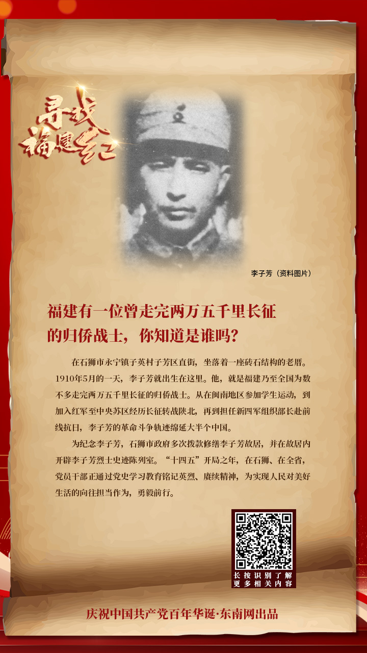 從在閩南地區(qū)參加學生運動,到加入紅軍至中央蘇區(qū)經(jīng)歷長征轉(zhuǎn)戰(zhàn)陜北,再到擔任新四軍組織部長赴前線抗日,李子芳的革命斗爭軌跡綿延大半個中國。百年黨史中,李子芳等無數(shù)革命先烈用堅若磐石的理想信念、百折不撓的英雄氣概、舍生忘死的犧牲精神,為后人換了日月新天。